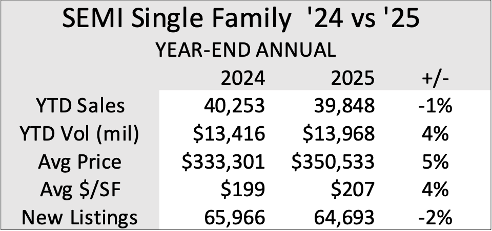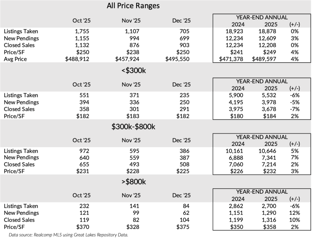 Southeast Michigan closed out 2025 with sales activity essentially even with 2024, but with continued price growth and higher overall dollar volume. Closed sales slipped just 1% year over year, while average sale price rose 5% and price per square foot increased 4%.